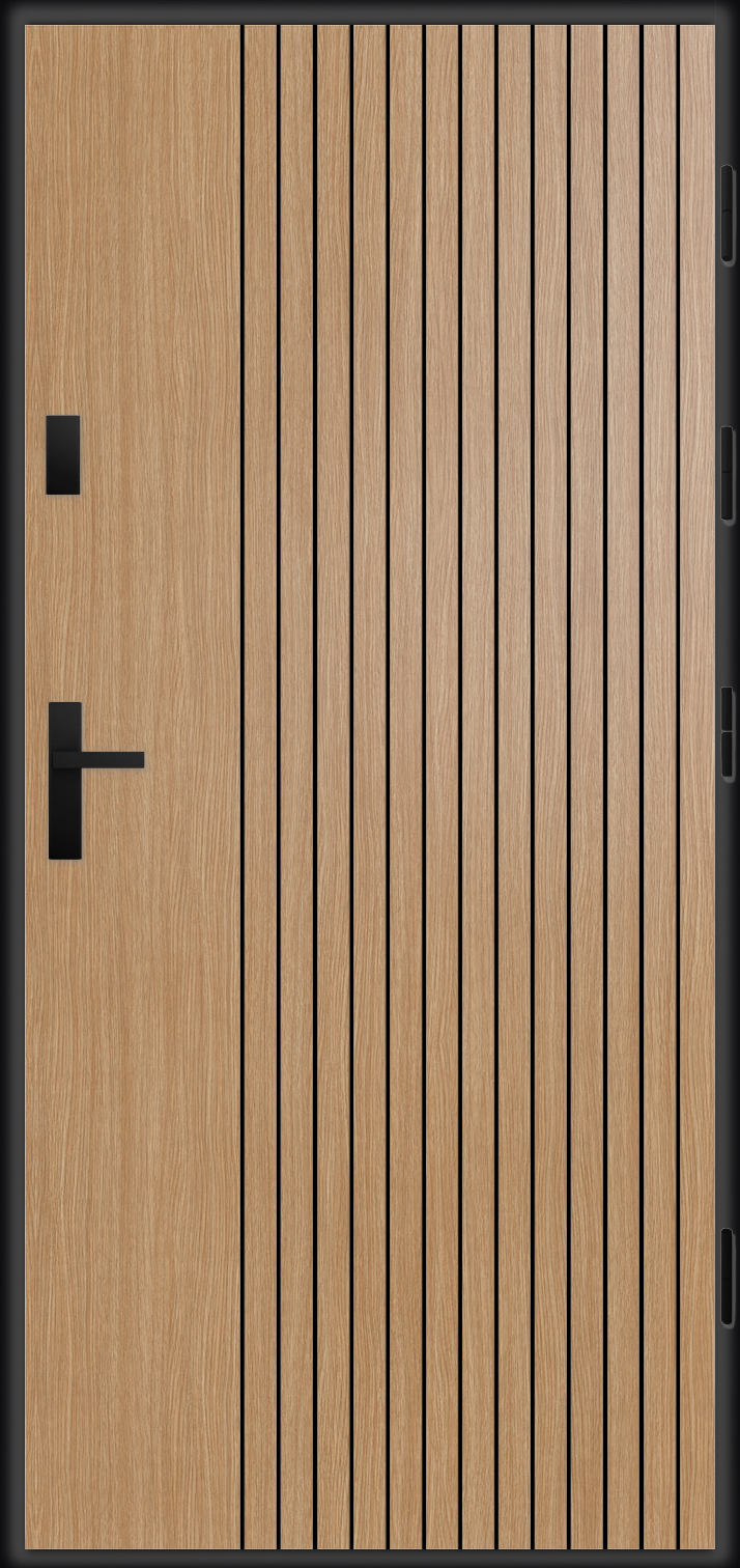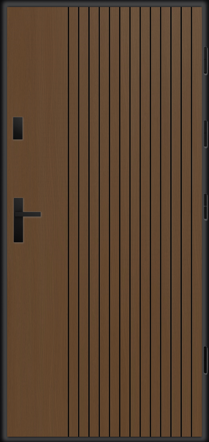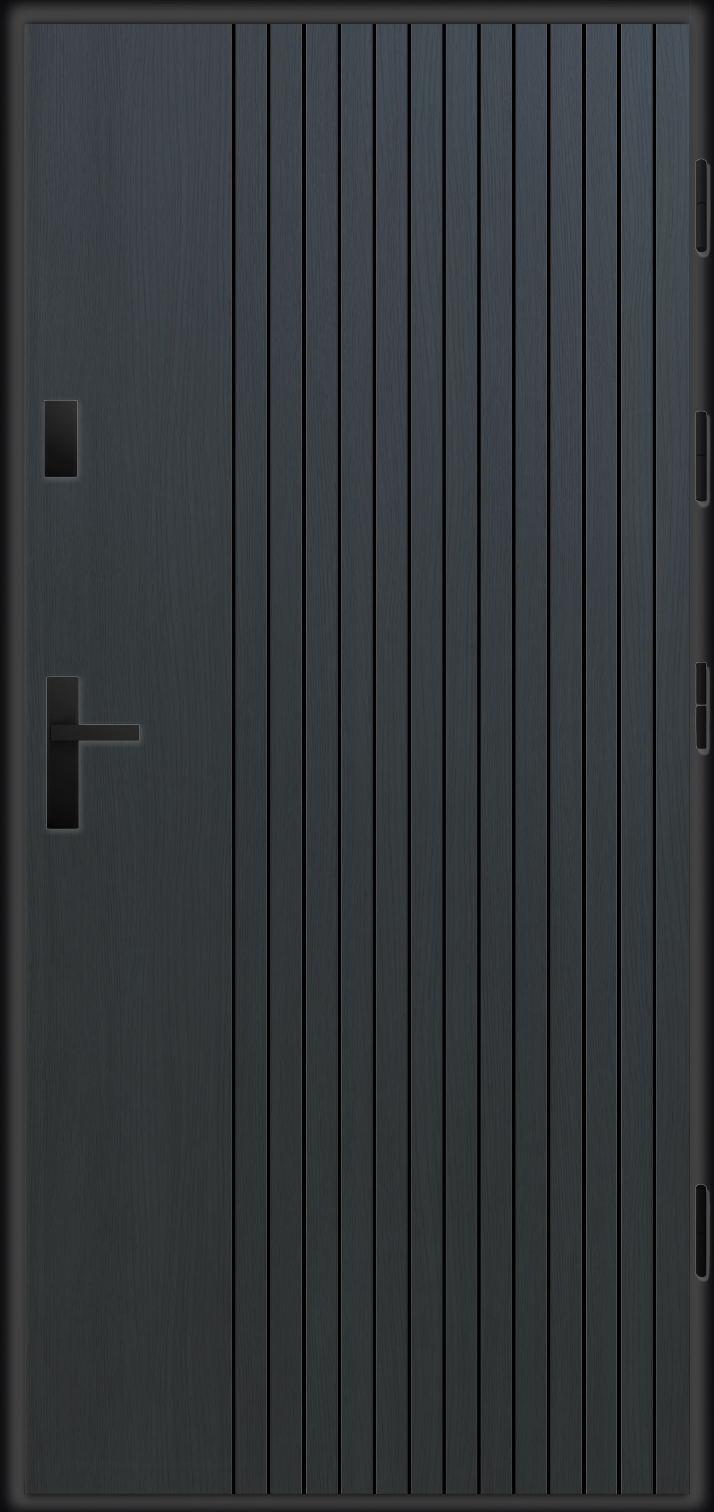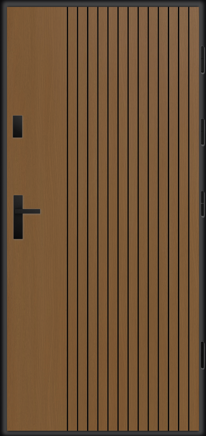 Model NEXA z kolekcji Vanguard to propozycja dla osób, które szukają drzwi o wyrazistym, nowoczesnym charakterze. Minimalistyczna forma, pionowe podziały i dekoracyjne intarsje tworzą efektowne wejście do domu, a produkcja na wymiar pozwala dopasować drzwi do projektu elewacji i konkretnego otworu.