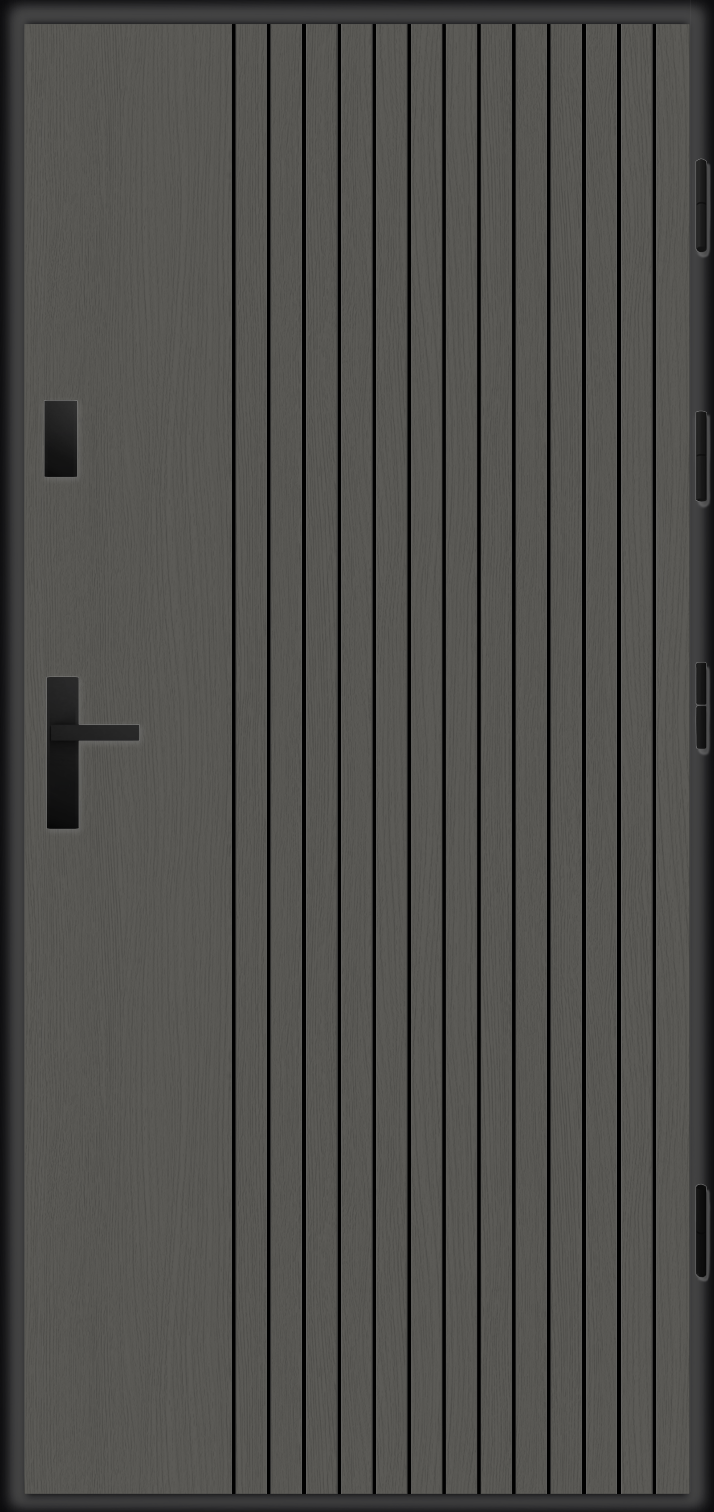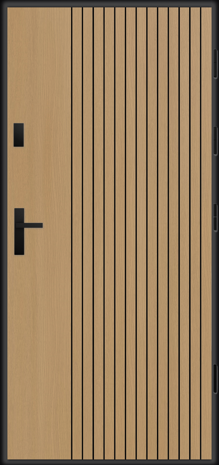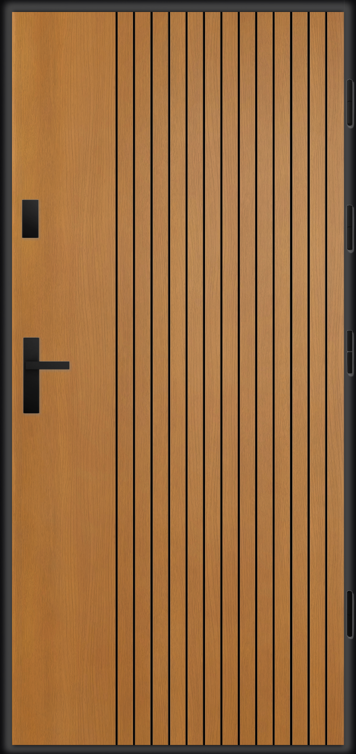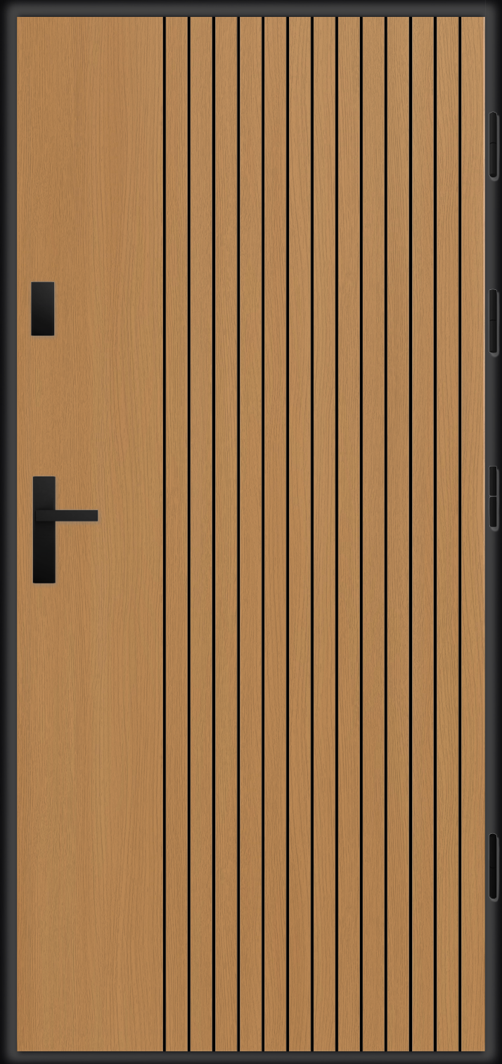 Model NEXA z kolekcji Vanguard to propozycja dla osób, które szukają drzwi o wyrazistym, nowoczesnym charakterze. Minimalistyczna forma, pionowe podziały i dekoracyjne intarsje tworzą efektowne wejście do domu, a produkcja na wymiar pozwala dopasować drzwi do projektu elewacji i konkretnego otworu.