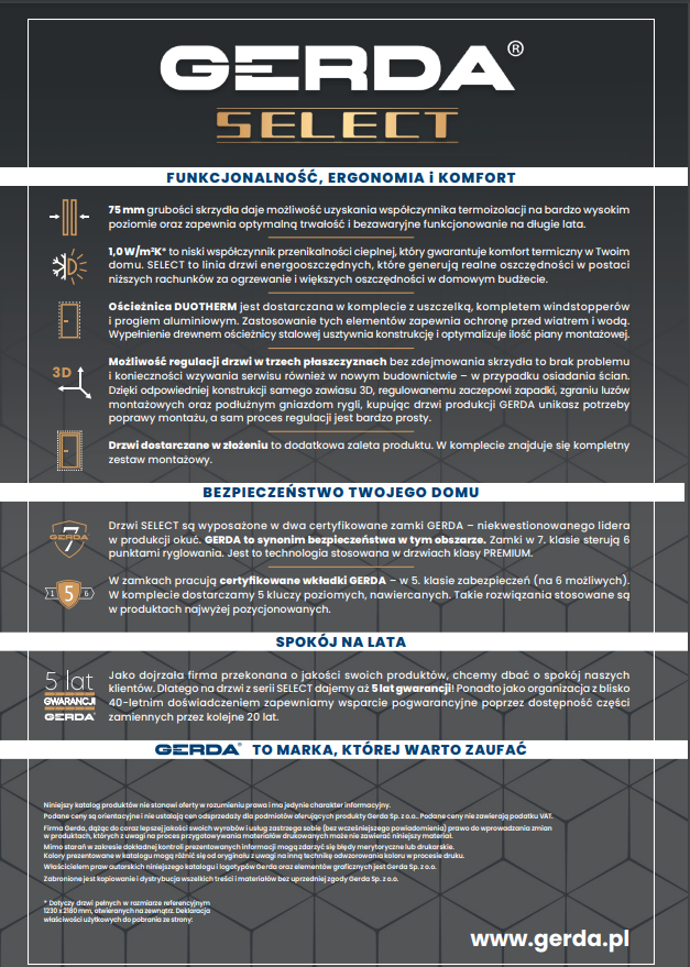 Drzwi SELECT, dzięki grubości skrzydła 75mm, solidnej konstrukcji i ciepłej ościeżnicy DUOTHERM osiągają efektywną termoizolację na poziomie Ud = 1,1 W/m²K (Ud = 1,0 W/m²K dla drzwi pełnych)