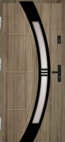 MARTOM B 23/29 to model z kolekcji Modern, czyli linii nowoczesnych drzwi z aplikacjami w kolorze stali nierdzewnej szczotkowanej lub czarnym. Wzór dobrze wpisuje się w nowoczesne elewacje i daje szerokie możliwości dopasowania koloru, detali oraz przeszklenia do stolarki okiennej i charakteru domu