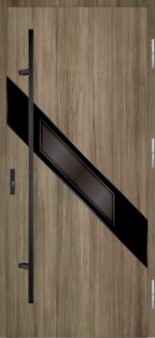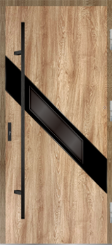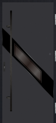 MARTOM GS 97/64 to model z kolekcji Diamond, zewnętrzna tafla szkła jest wykonana z dwóch szyb o grubości 3mm laminowanych (sklejonych za pomocą specjalnej folii w wysokiej temperaturze). Dzięki temu przeszklenie jest bardzo odporne i ma cechy szkła bezpiecznego. Nadrukowana czarna obwoluta znajduje się pomiędzy laminowanymi szybami, co zapewnia jej całkowitą ochronę przed uszkodzeniem. Tafla szklana o łącznej grubości 6mm ma szlifowane krawędzie. Eliminuje to możliwość zranienia o ostrą krawędź i nadaje przeszkleniu wyjątkowy wygląd. Tafla zewnętrzna jest zintegrowana z pakietem szybowym i jest mocowana do zewnętrznej powierzchni skrzydła. Od strony wewnętrznej skrzydła pakiet szybowy jest wykończony ramką z aluminium anodowanego na kolor czarny.