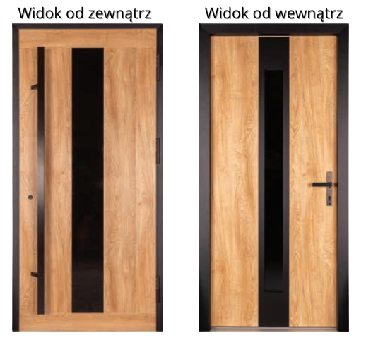 Strona zewnętrzna: ostatnia tafla pakietu szybowego jest wykonana ze szkła, które ma lakierowaną czarną obwolutę. Dodatkowo przeszklenie może mieć różne opcje, np. lustro weneckie lub reflex. Powierzchnia szyby jest idealnie zlicowana z wypełnieniem skrzydła.