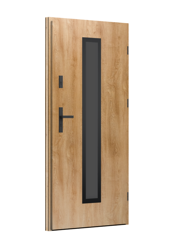 - Skrzydło drzwiowe z uszczelką, wypełnione pianką poliuretanową oraz ramiakiem z drewna klejonego.