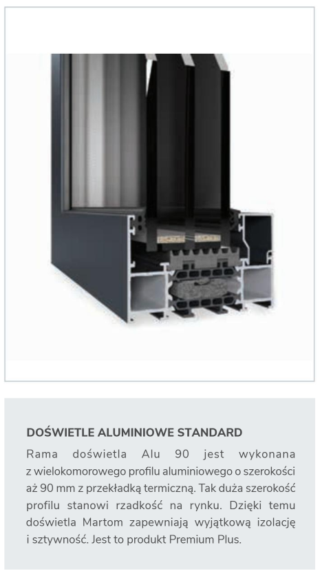 MARTOM w swojej ofercie posiada doświetla wykonane w technologii aluminiowej. Profil o szerokości 90 mm to absolutny lider na rynku. Budowa przeszklenia w doświetlach to pakiet trzyszybowy z dwoma komorami wypełnionymi gazem szlachetnym oraz ciepła ramka dystansowa. Dzięki zastosowaniu technologii druku cyfrowego MARTOM proponuje wzornictwo drzwi z doświetlami praktycznie nieograniczone. Oprócz standardowych całkowicie przeziernych przeszkleń klienci mogą wybrać między innymi: przeszklenia reflex brąz lub grafit, lustro weneckie, piaskowane, mleczne.